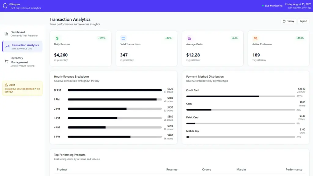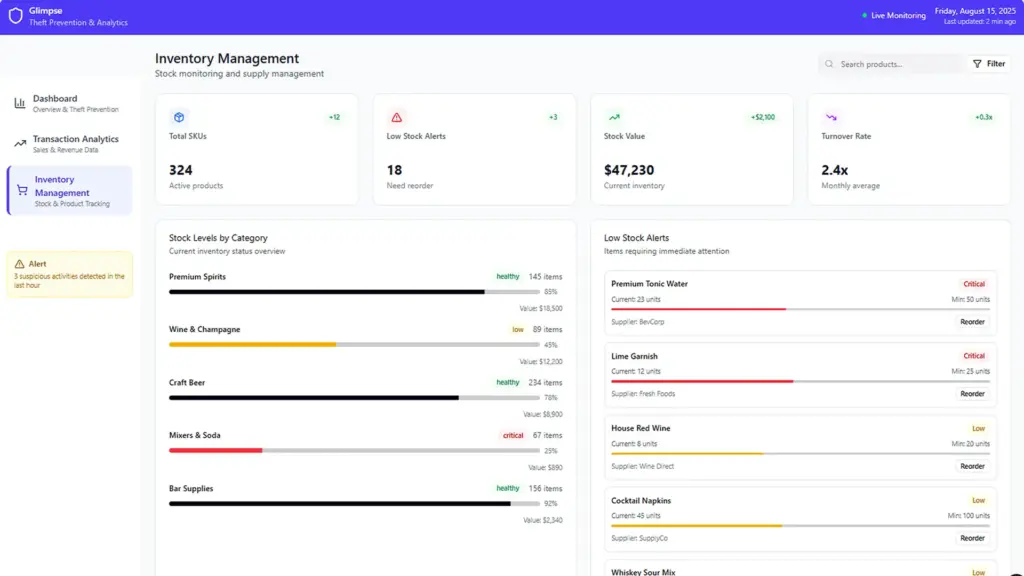 From single-unit bars and nightclubs to international restaurant chains, Glimpse is designed for the fast-paced world of hospitality. It offers transaction analytics and inventory management for bars, restaurants, and nightclubs. As an outcome, Glimpse has developed 3 applications: AI Video Analyses, Inventory Application, and Sales Reports.