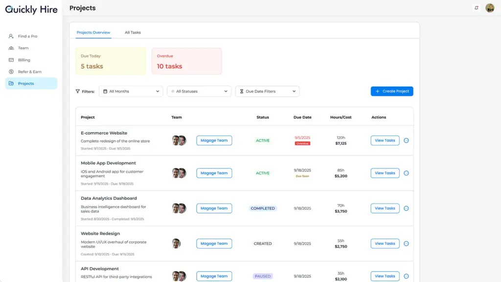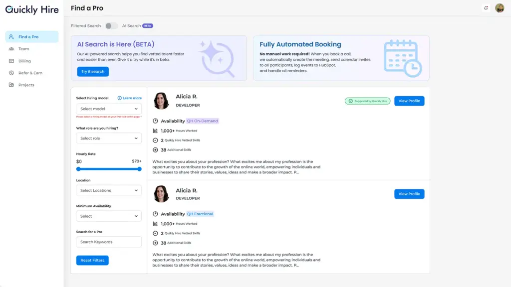 Each expert goes through a screening process (technical assessments, portfolio review, interviews). Only those who pass join the “Quickly Hire Pro” network. Profiles include detailed skill tags, past work samples, client reviews, and availability indicators.