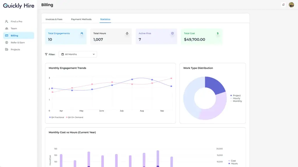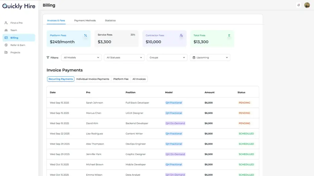Brand & Market Positioning: Quickly Hire gained trust and recognition within target segments (startups, agencies, SMBs) as a differentiated model between freelance marketplaces and staffing agencies.