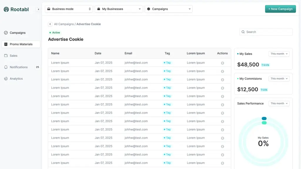 - Comprehensive Tracking & Dashboards: Rootabl offers detailed insights into affiliate sales and lead tracking through an intuitive dashboard, ensuring creators have full visibility over their program’s performance.